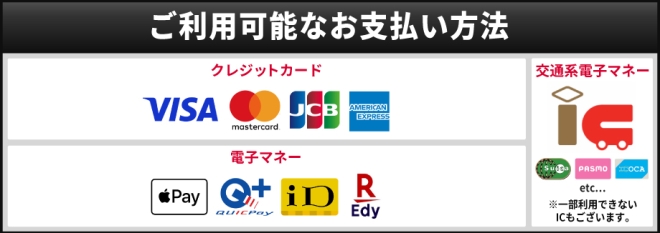 アップルペイ・クイックペイ・iD・交通系IC・楽天Edyもお使いいただけます!